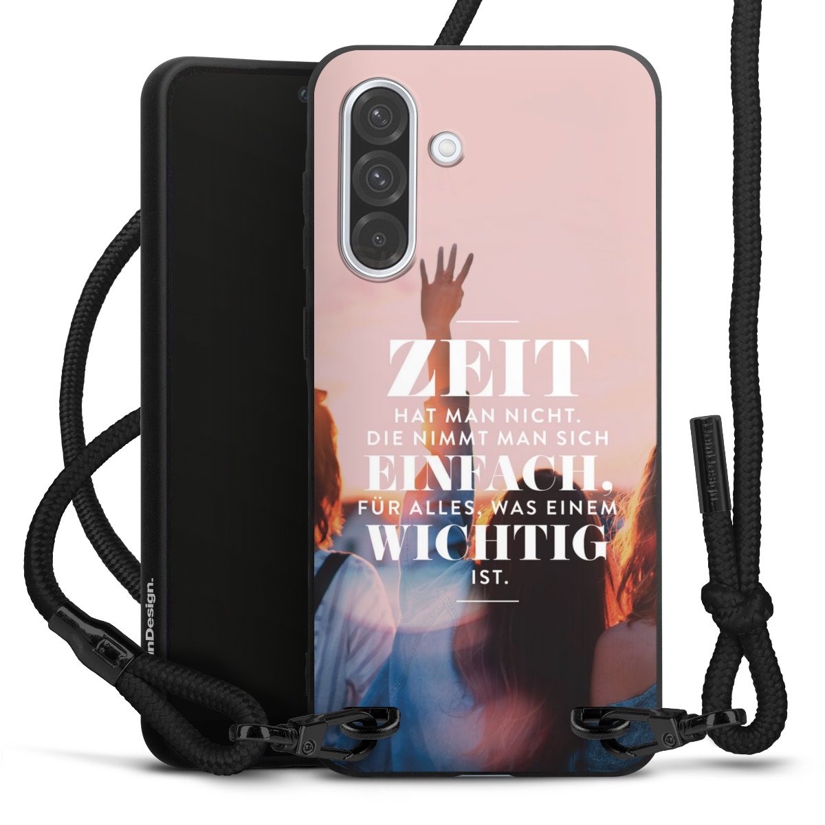 Pure Black: Handyhülle, Stoffband und Metalldetails in stylischem Mattschwarz.