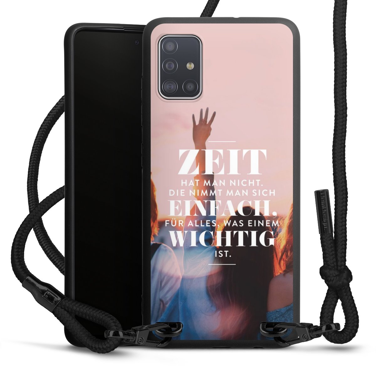 Pure Black: Handyhülle, Stoffband und Metalldetails in stylischem Mattschwarz.