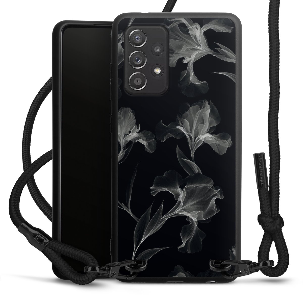 Pure Black: Handyhülle, Stoffband und Metalldetails in stylischem Mattschwarz.
