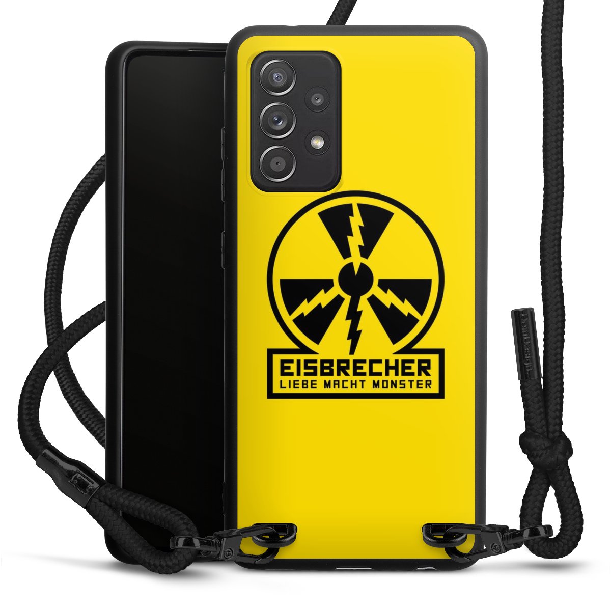 Pure Black: Handyhülle, Stoffband und Metalldetails in stylischem Mattschwarz.