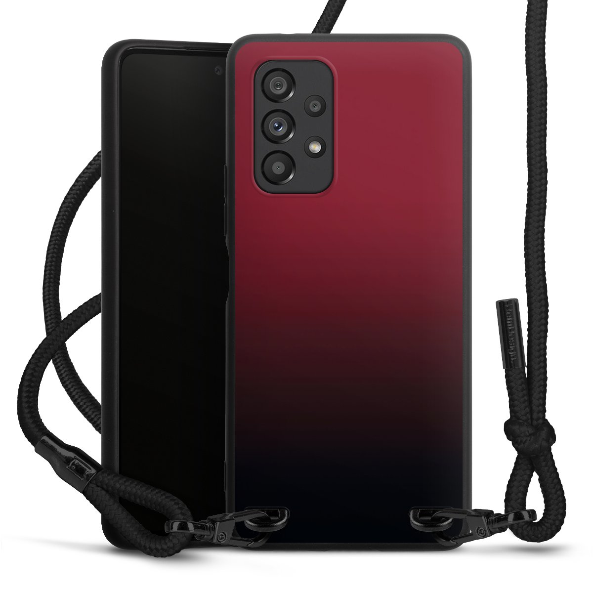 Pure Black: Handyhülle, Stoffband und Metalldetails in stylischem Mattschwarz.