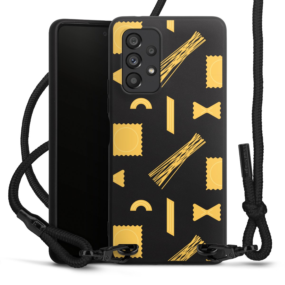 Pure Black: Handyhülle, Stoffband und Metalldetails in stylischem Mattschwarz.