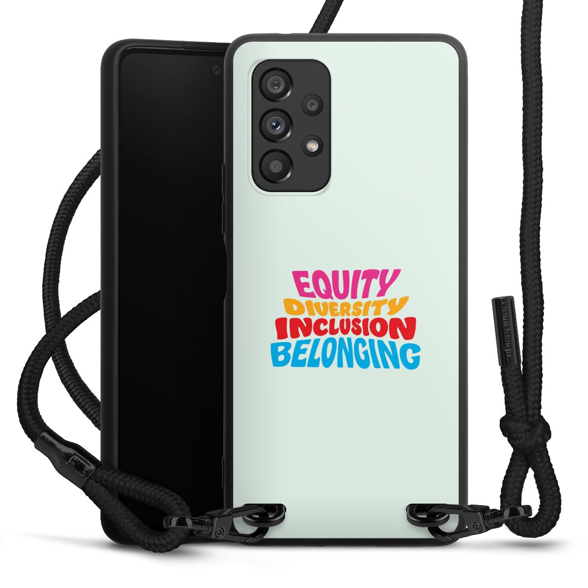 Die mattschwarze Silikonhülle besteht aus flexiblen TPU (thermoplastisches Polyurethan) und bietet robusten Schutz. Durch das langlebige, bruchsichere Material ist die Hülle biegsam und formbeständig zugleich. Die matte Oberfläche lässt Dein Design besser zur Geltung kommen und ist weniger anfällig für Fingerabdrücke und Schmutz. Das stylische Trend-Accessoire liegt griffig in der Hand und wird optimal von der Handykette aus Stoff (Polyester) ergänzt. Das geflochtene Stoffband ist ca. 1,70 Meter lang mit einem Durchmesser von ca. 0,5cm. Aufgrund der besonderen Knotentechnik ist das Band durch einfaches Ziehen in der Länge verstellbar. Als kleines i-Tüpfelchen haben wir das Band mit schicken Metall-Verschlüssen in Mattschwarz versehen.