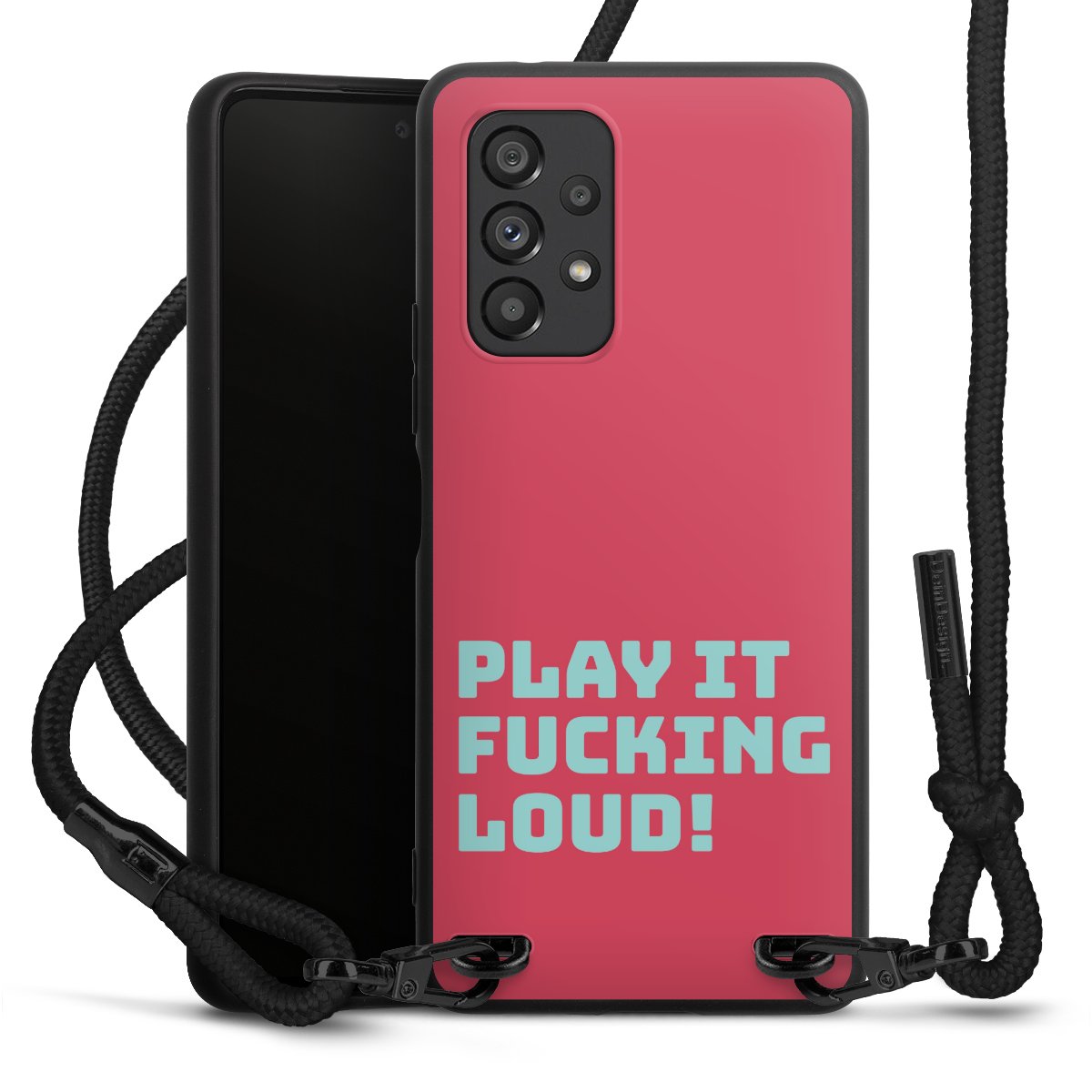 Pure Black: Handyhülle, Stoffband und Metalldetails in stylischem Mattschwarz.