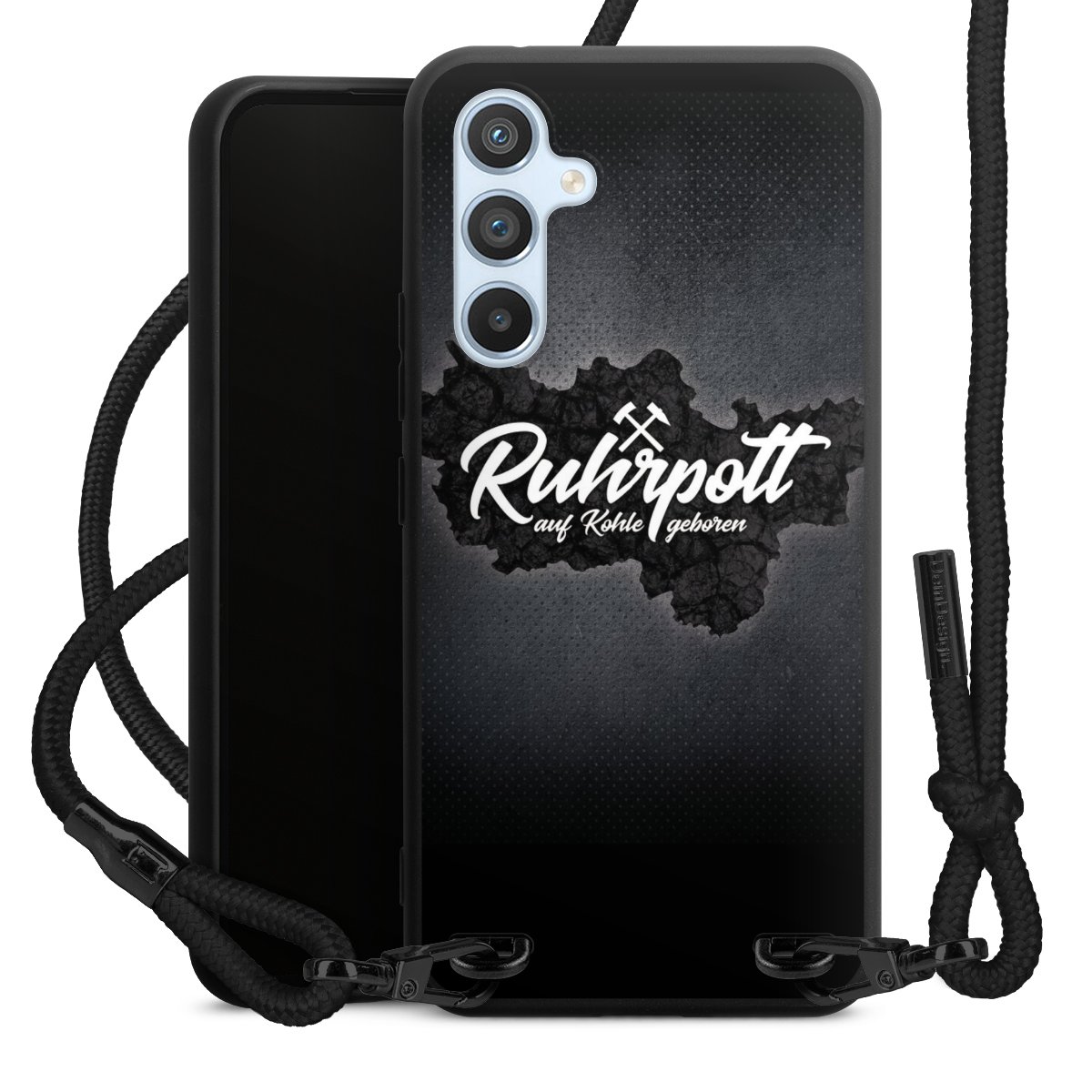 Pure Black: Handyhülle, Stoffband und Metalldetails in stylischem Mattschwarz.