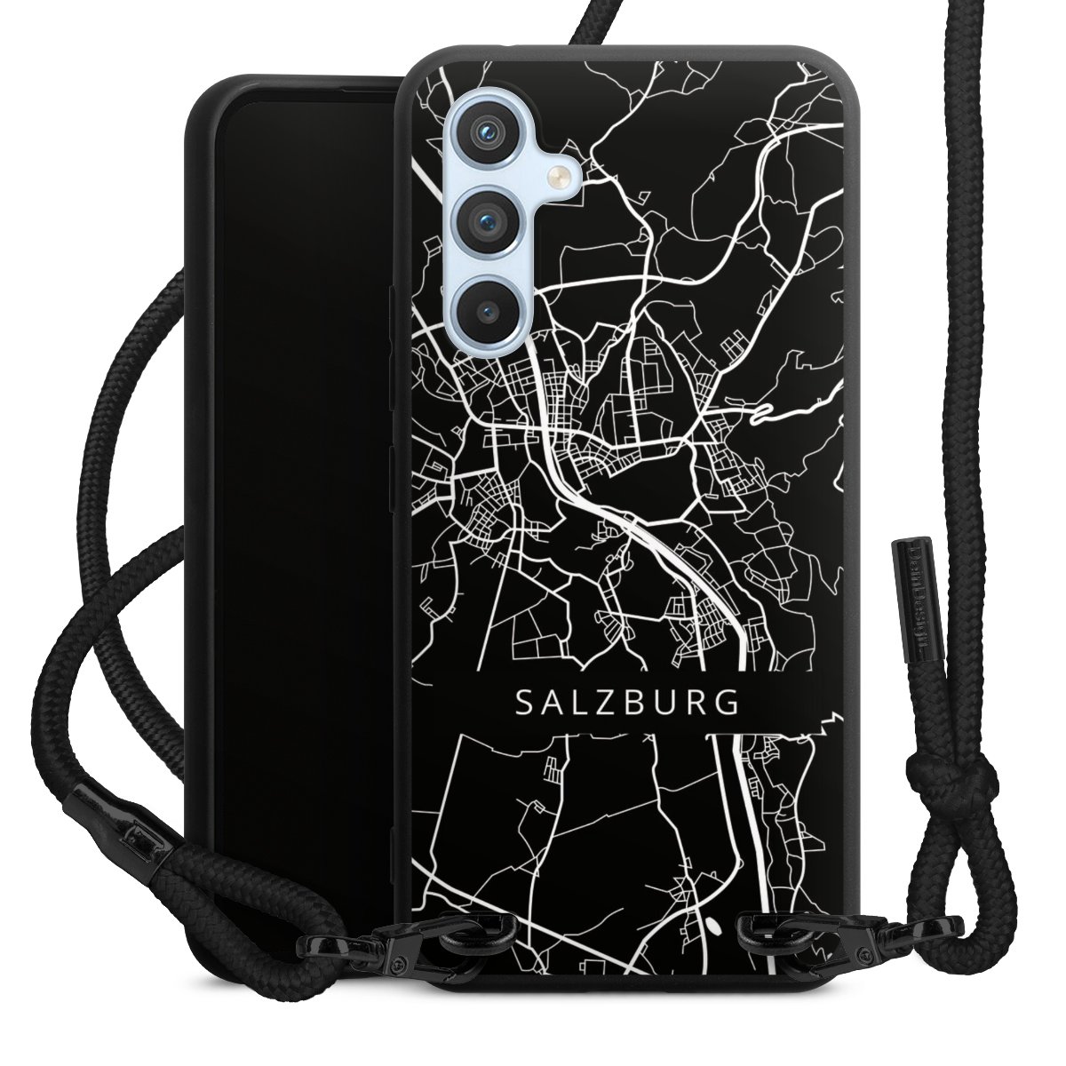Pure Black: Handyhülle, Stoffband und Metalldetails in stylischem Mattschwarz.