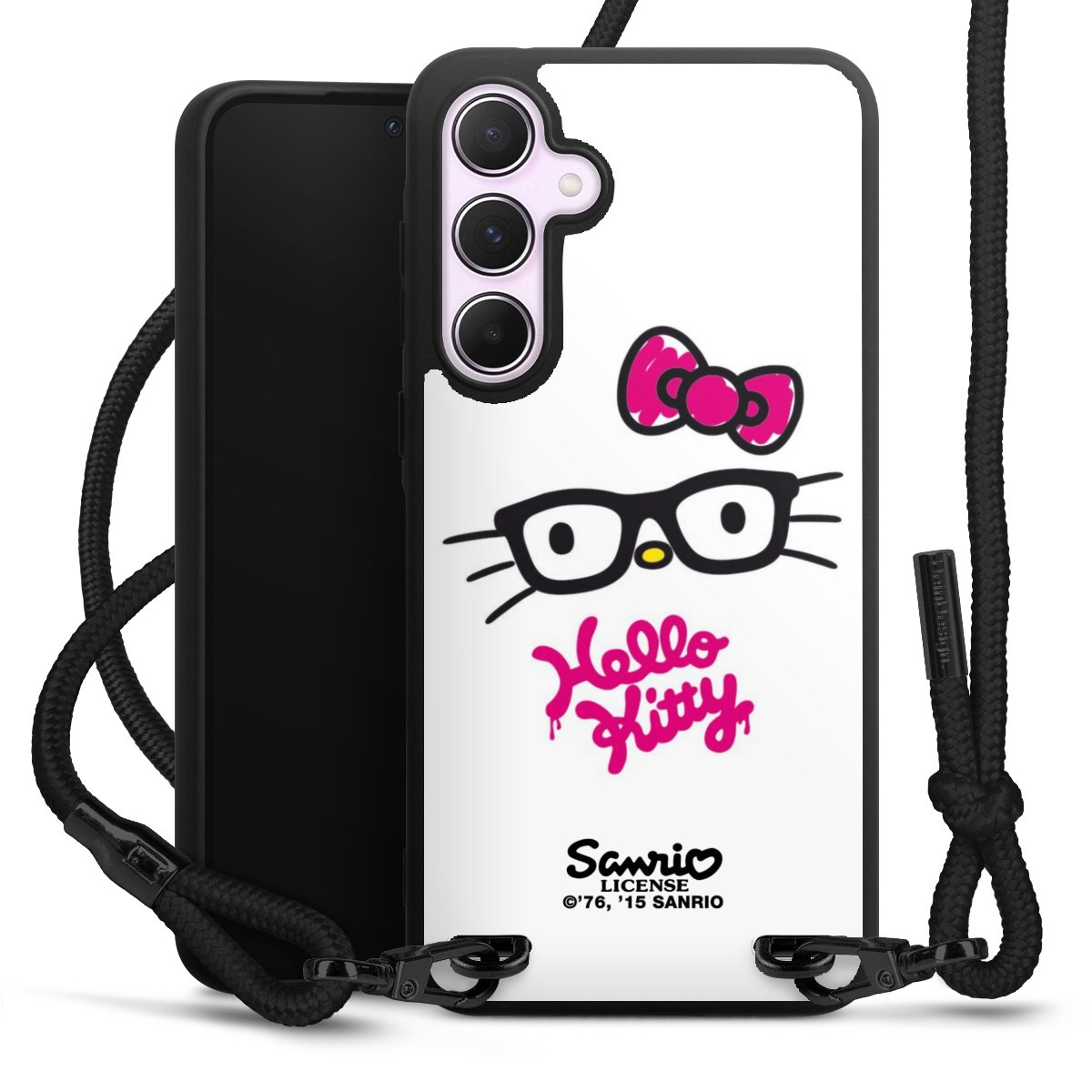 Pure Black: Handyhülle, Stoffband und Metalldetails in stylischem Mattschwarz.