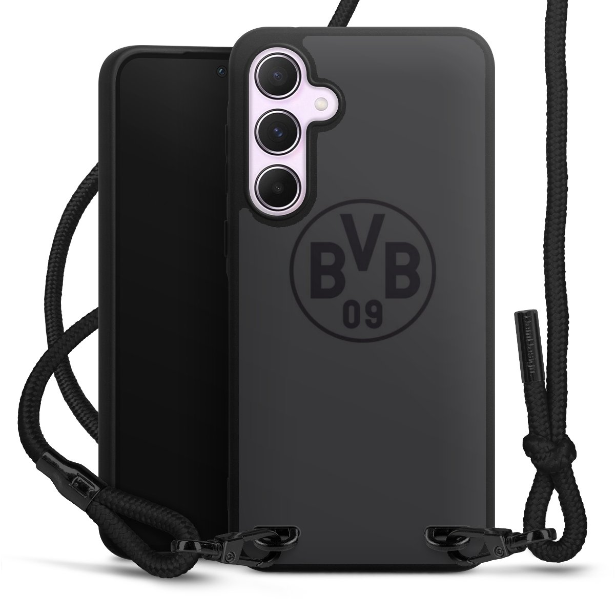 Pure Black: Handyhülle, Stoffband und Metalldetails in stylischem Mattschwarz.