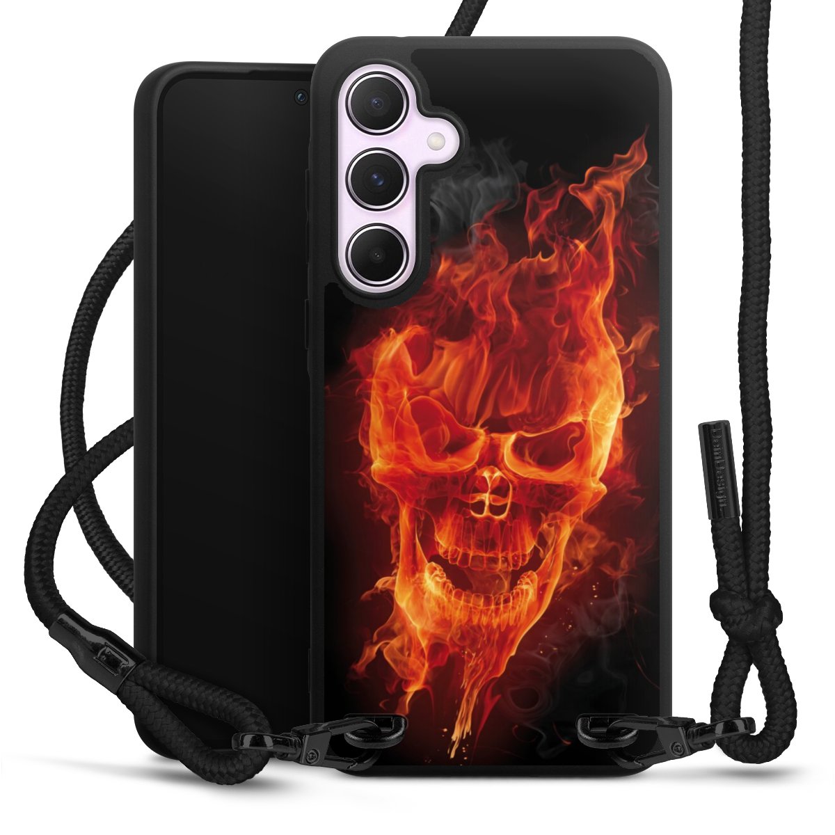 Pure Black: Handyhülle, Stoffband und Metalldetails in stylischem Mattschwarz.