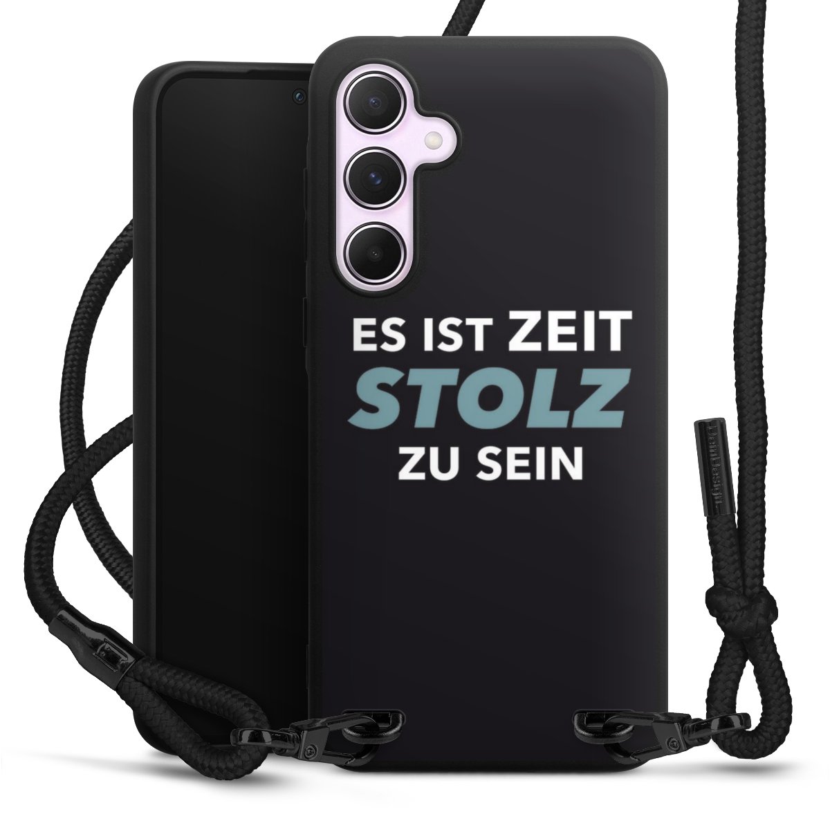 Pure Black: Handyhülle, Stoffband und Metalldetails in stylischem Mattschwarz.