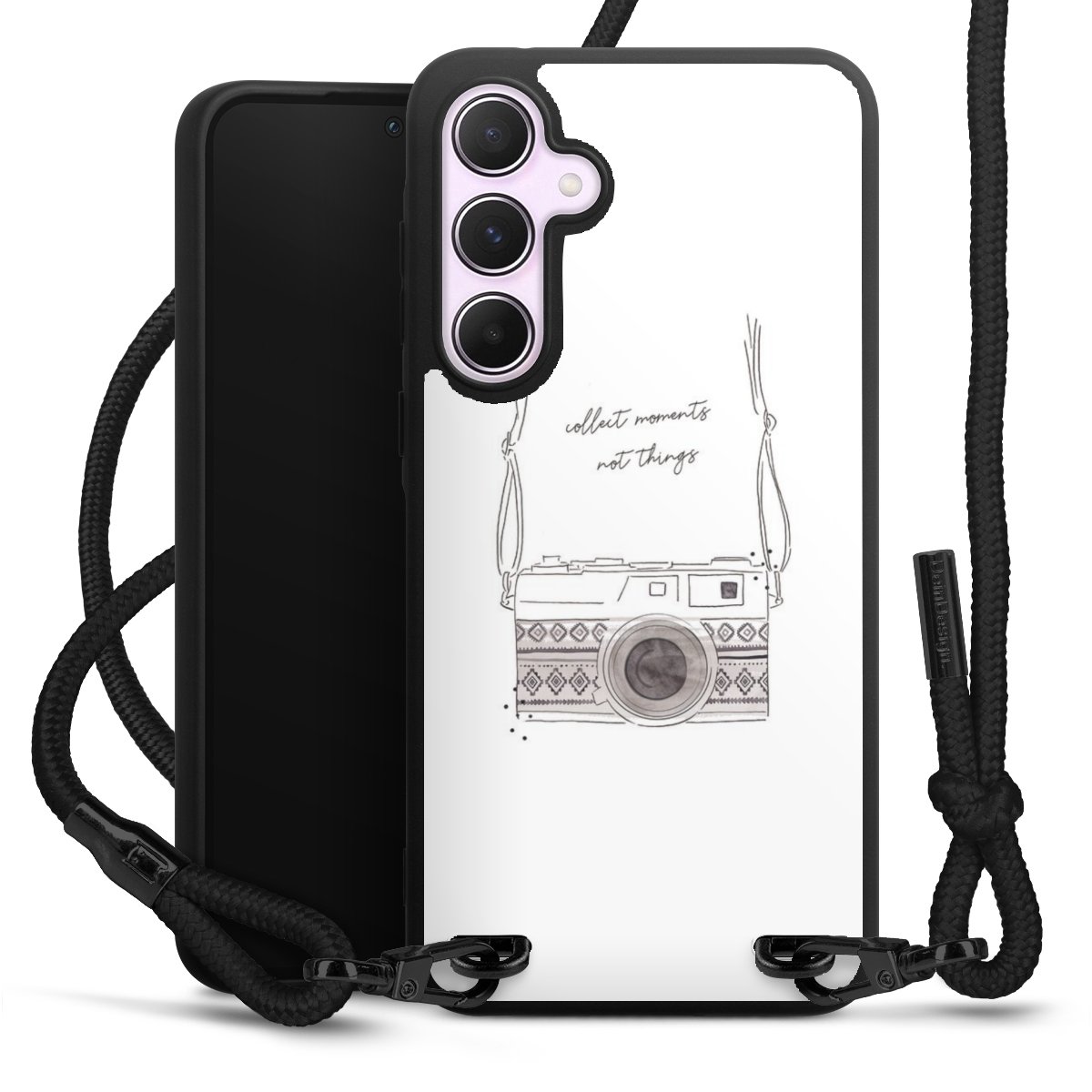 Pure Black: Handyhülle, Stoffband und Metalldetails in stylischem Mattschwarz.