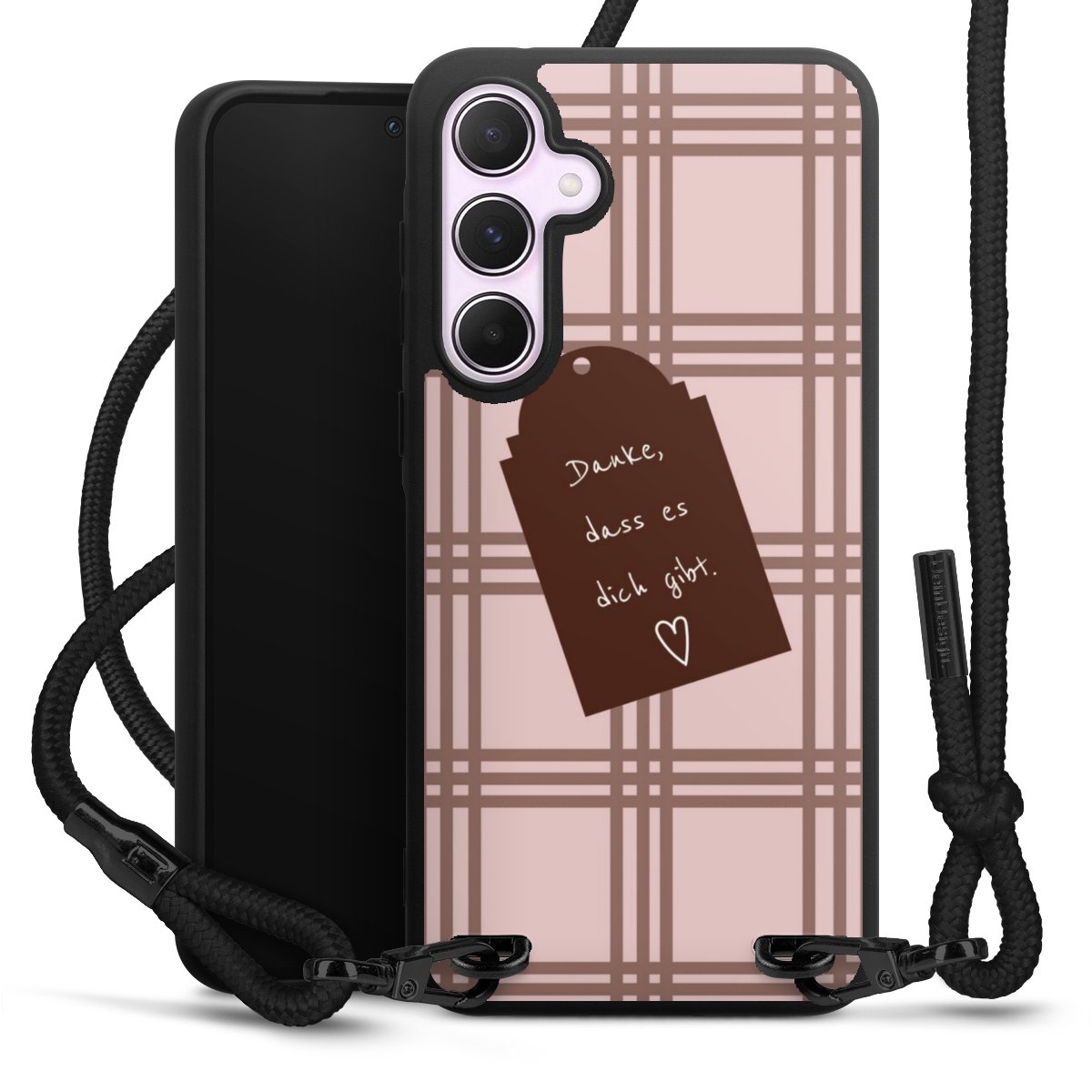 Pure Black: Handyhülle, Stoffband und Metalldetails in stylischem Mattschwarz.