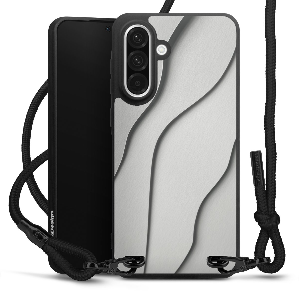 Pure Black: Handyhülle, Stoffband und Metalldetails in stylischem Mattschwarz.