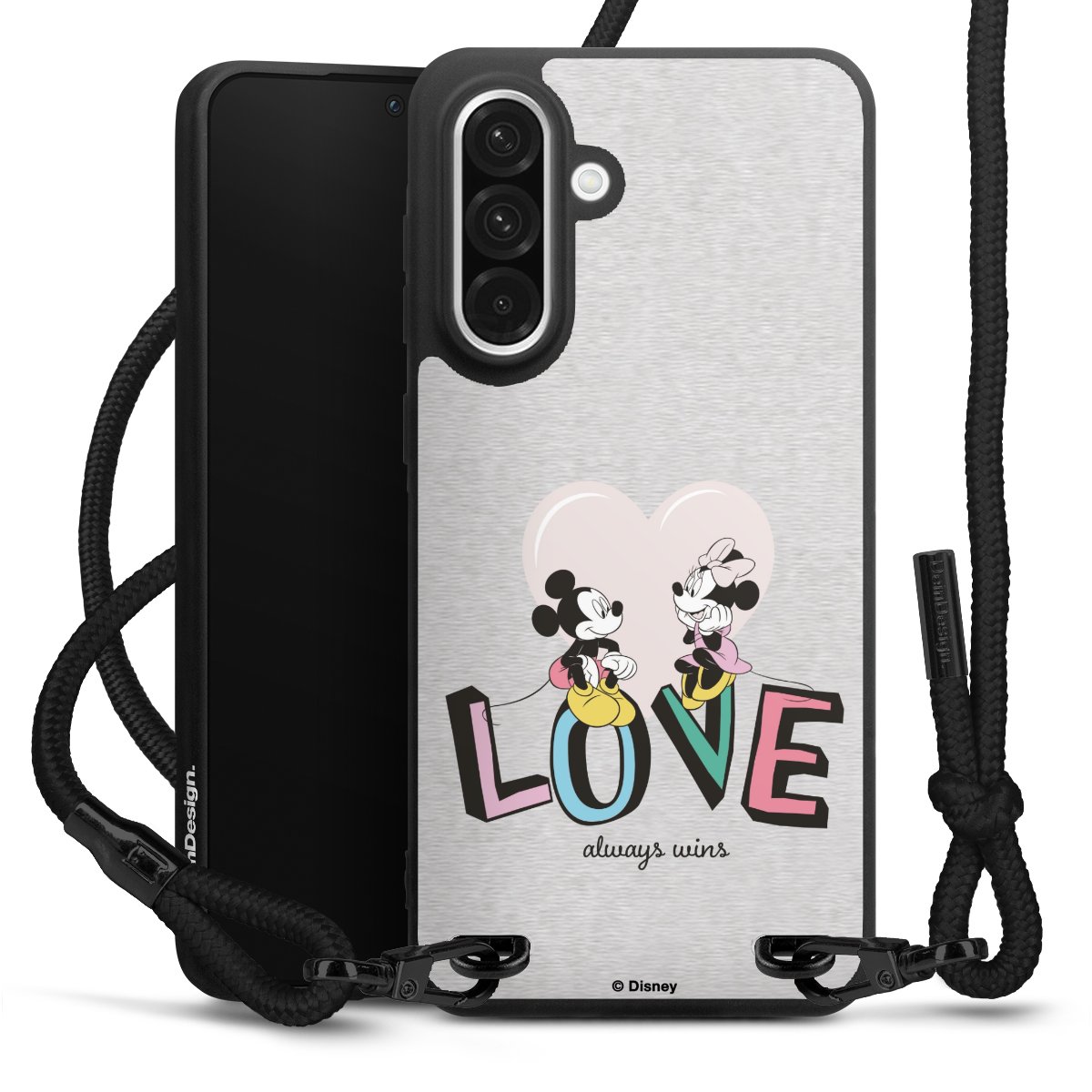 Pure Black: Handyhülle, Stoffband und Metalldetails in stylischem Mattschwarz.