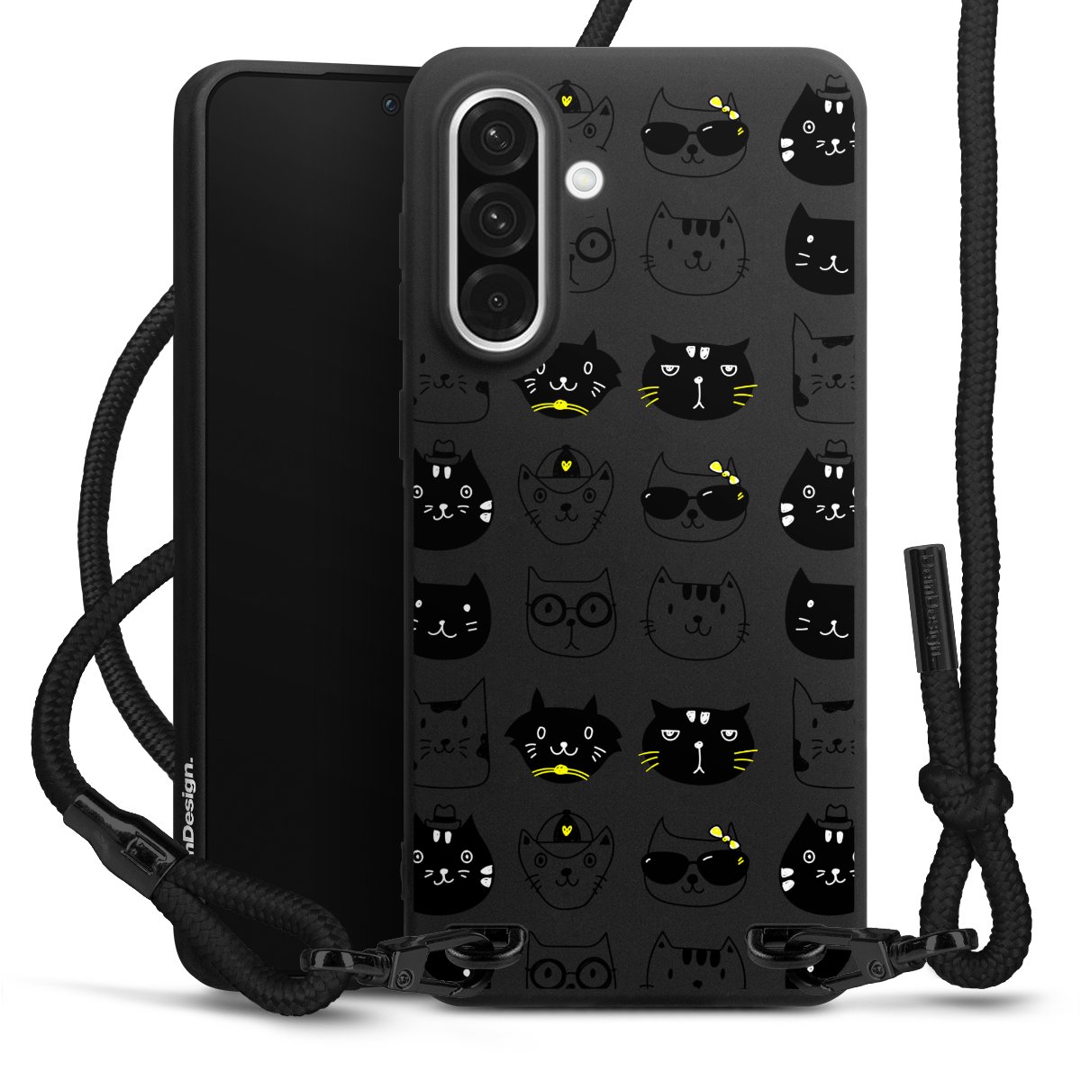 Pure Black: Handyhülle, Stoffband und Metalldetails in stylischem Mattschwarz.