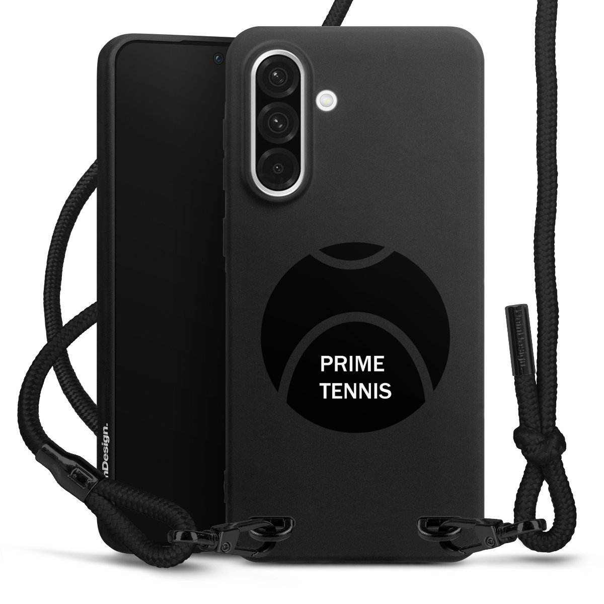 Pure Black: Handyhülle, Stoffband und Metalldetails in stylischem Mattschwarz.