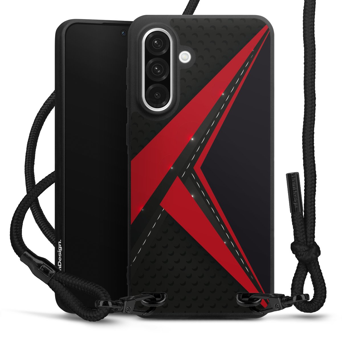 Pure Black: Handyhülle, Stoffband und Metalldetails in stylischem Mattschwarz.