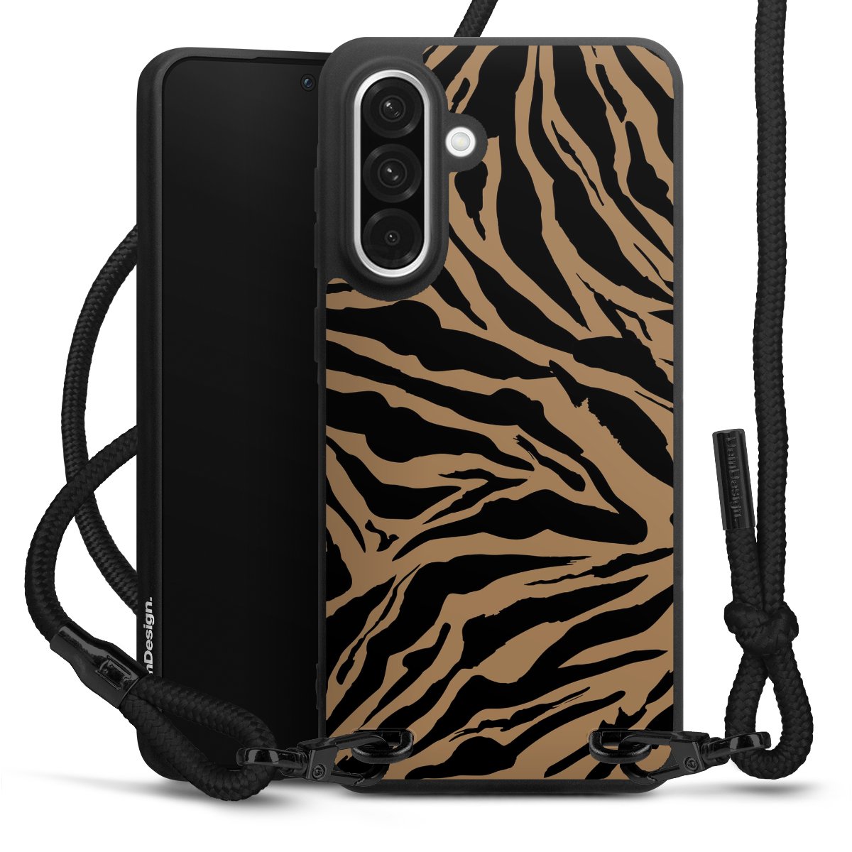 Pure Black: Handyhülle, Stoffband und Metalldetails in stylischem Mattschwarz.