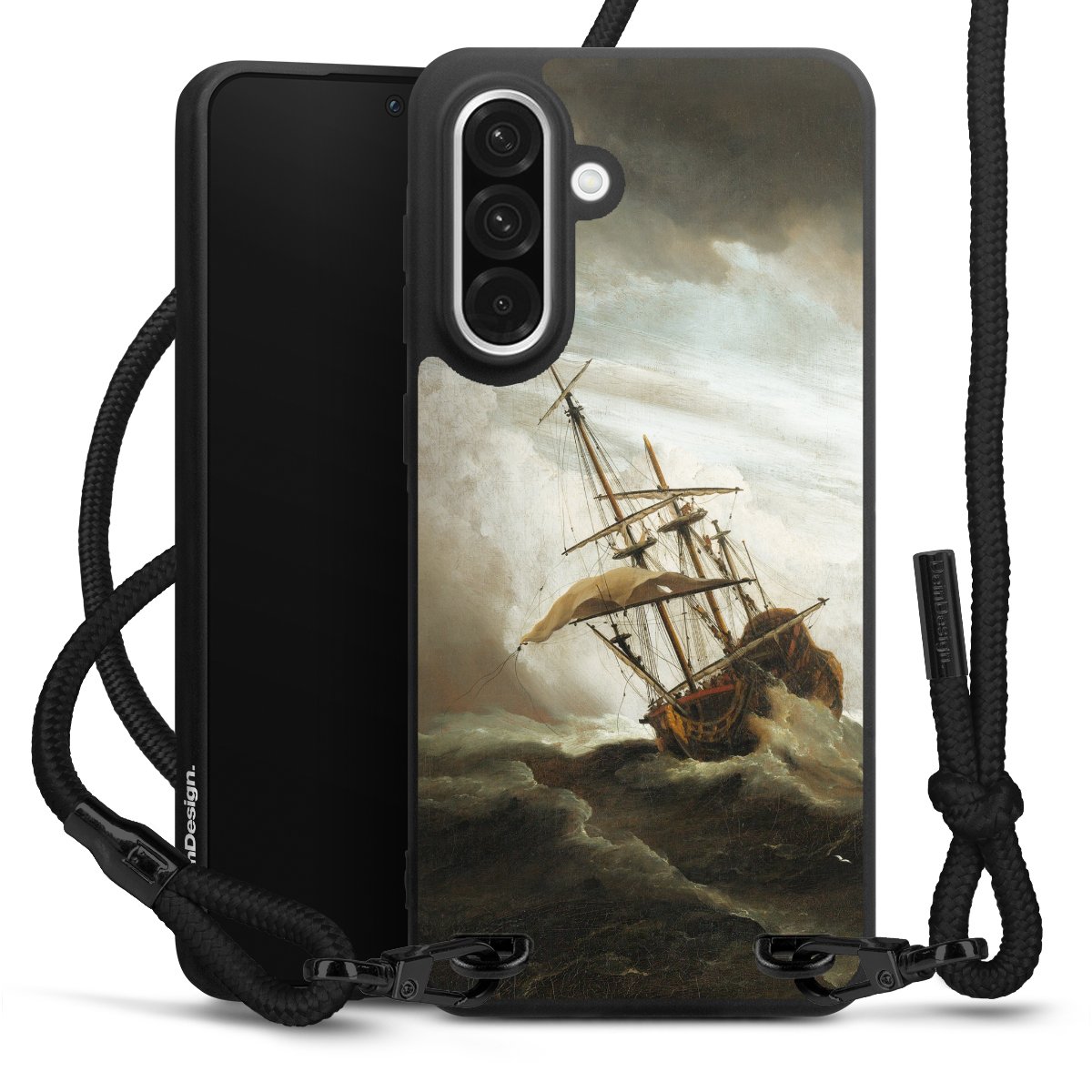 Pure Black: Handyhülle, Stoffband und Metalldetails in stylischem Mattschwarz.
