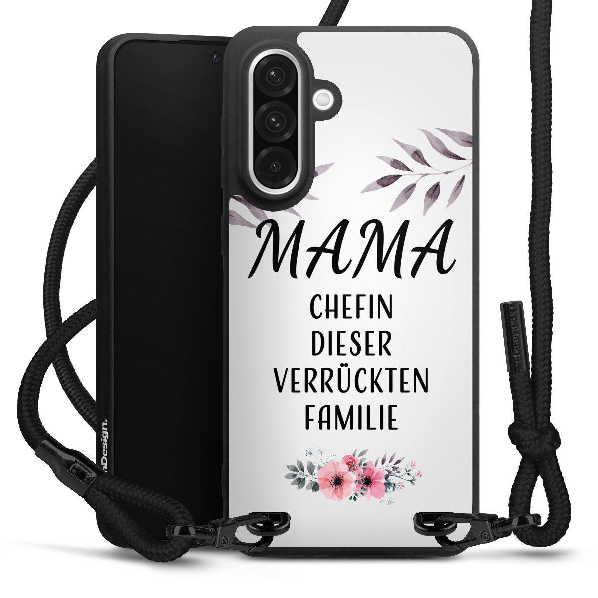 Pure Black: Handyhülle, Stoffband und Metalldetails in stylischem Mattschwarz.