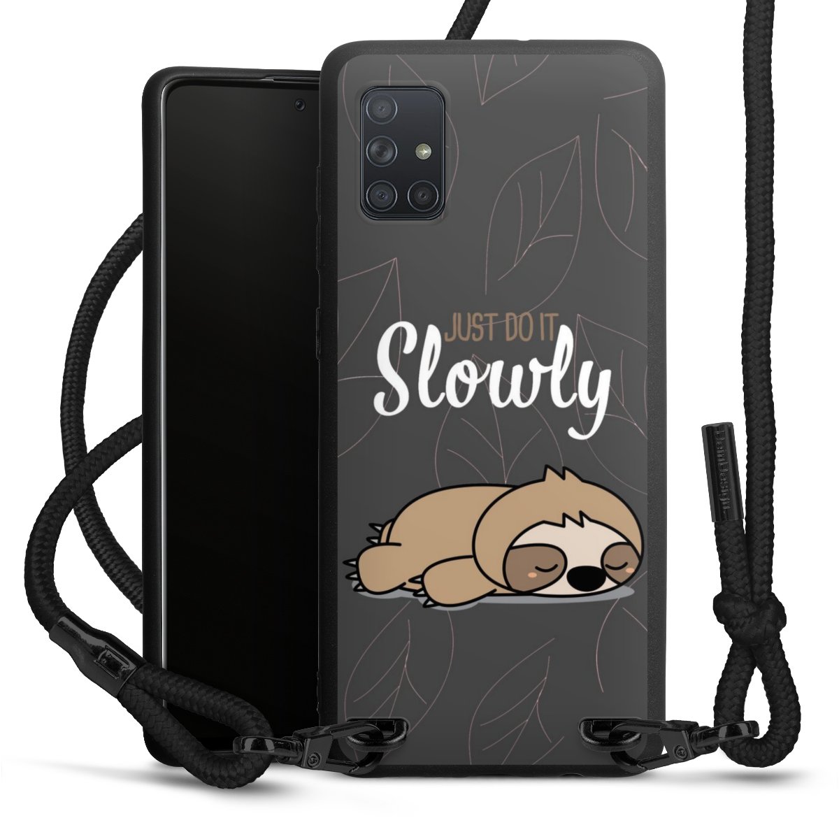Pure Black: Handyhülle, Stoffband und Metalldetails in stylischem Mattschwarz.