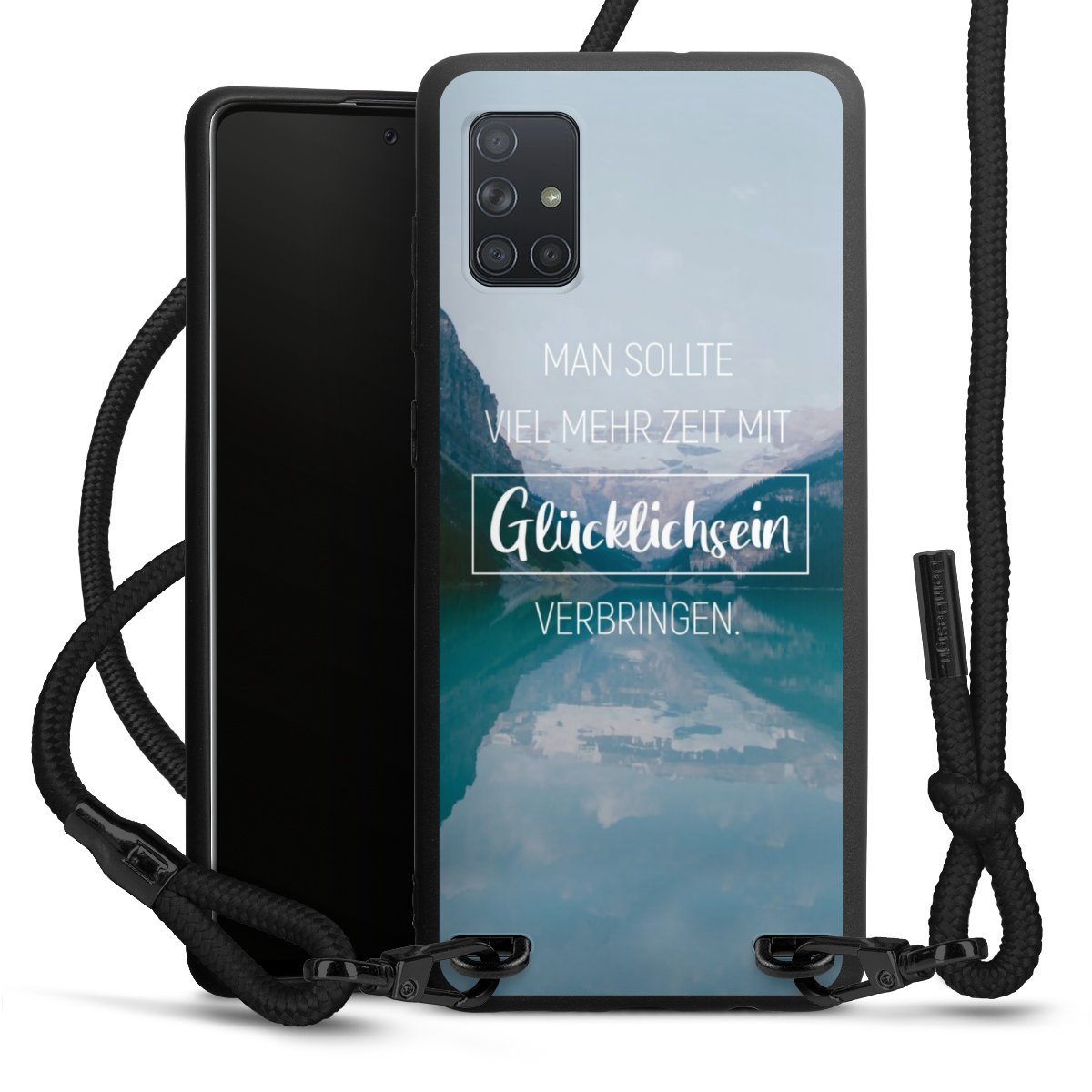 Pure Black: Handyhülle, Stoffband und Metalldetails in stylischem Mattschwarz.