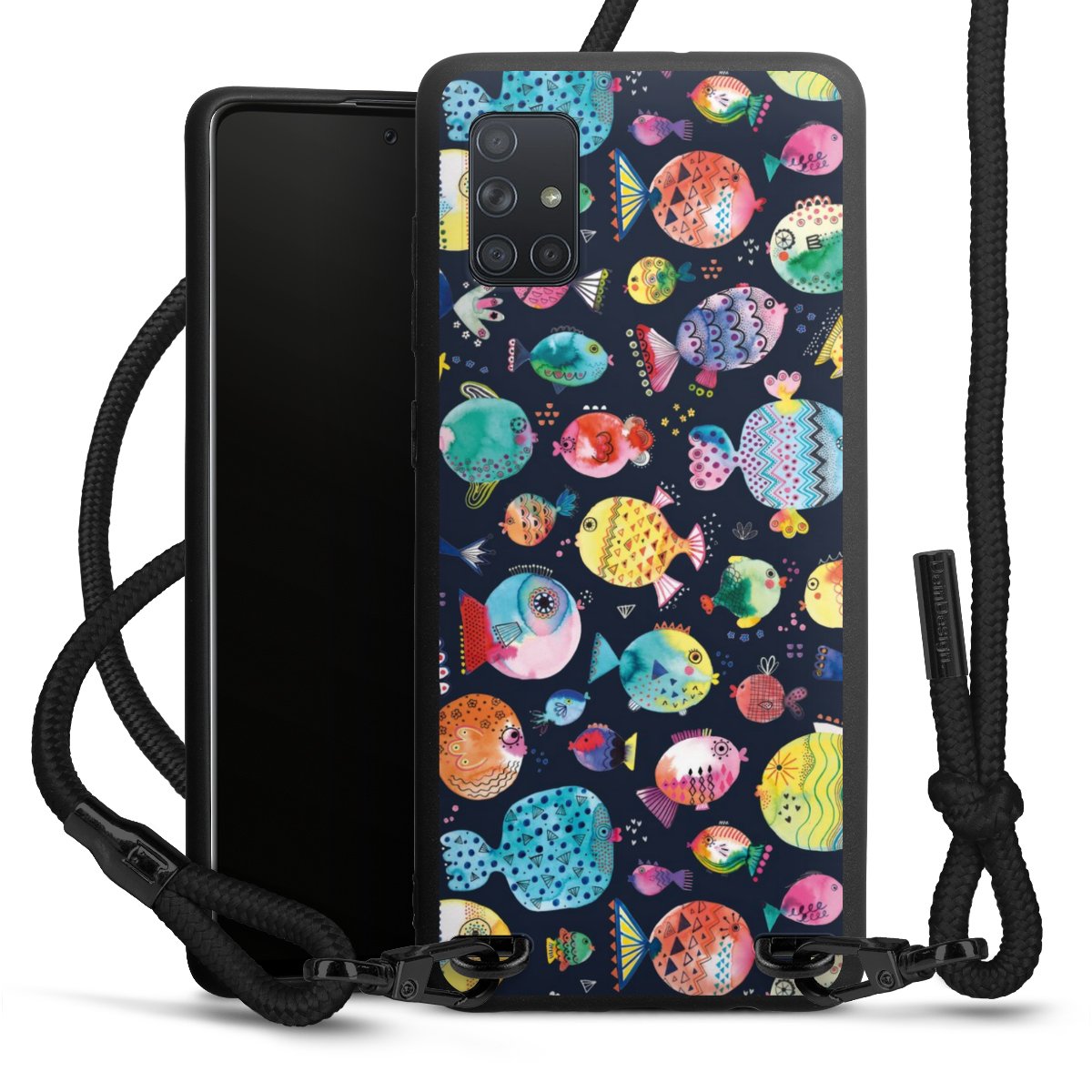 Pure Black: Handyhülle, Stoffband und Metalldetails in stylischem Mattschwarz.