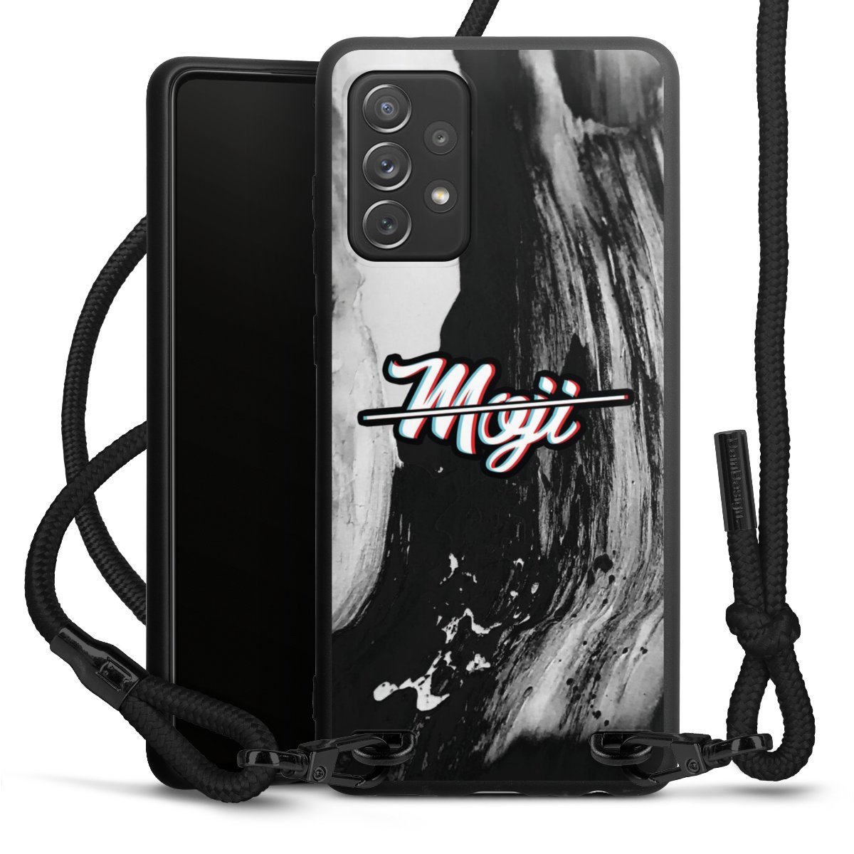 Pure Black: Handyhülle, Stoffband und Metalldetails in stylischem Mattschwarz.