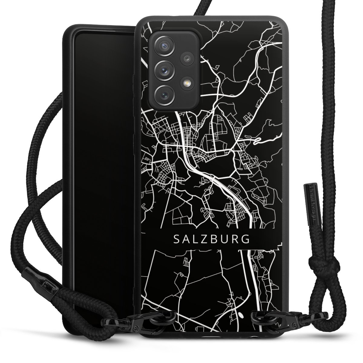 Pure Black: Handyhülle, Stoffband und Metalldetails in stylischem Mattschwarz.