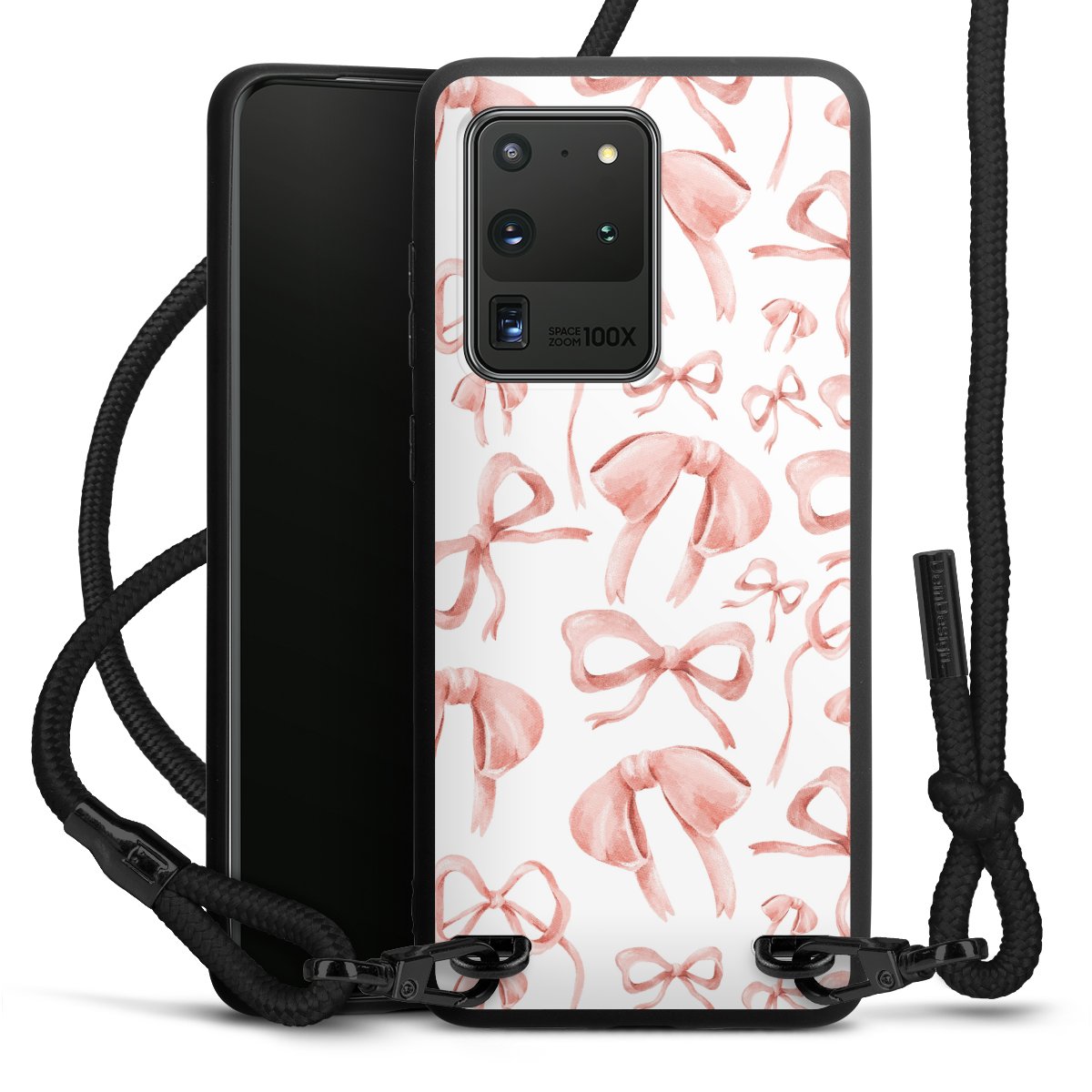 Pure Black: Handyhülle, Stoffband und Metalldetails in stylischem Mattschwarz.