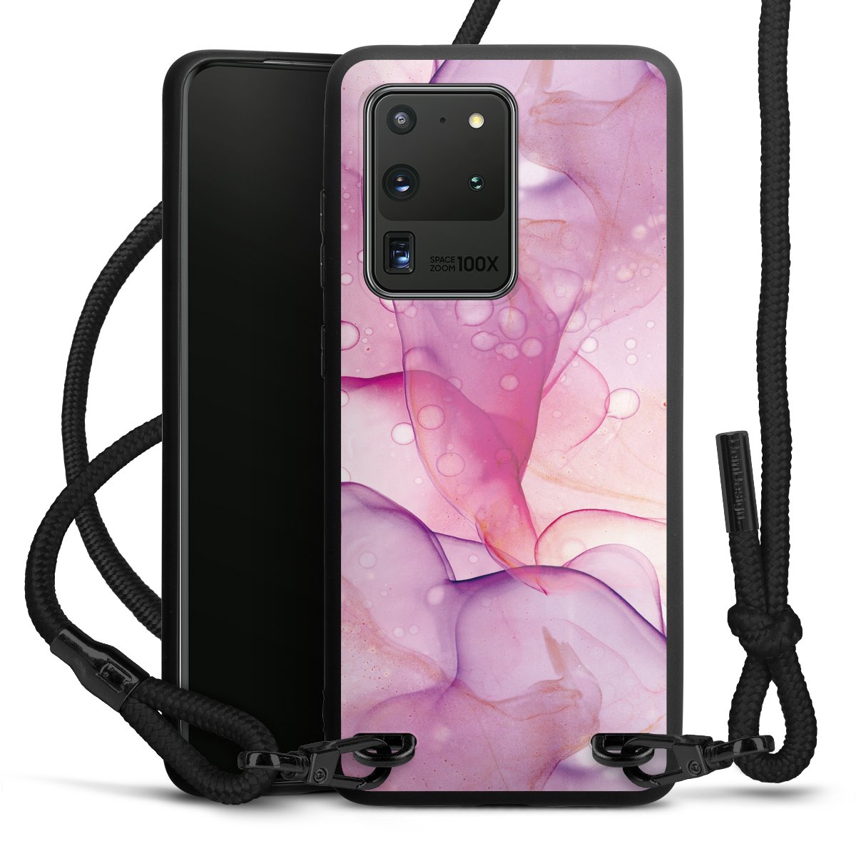 Pure Black: Handyhülle, Stoffband und Metalldetails in stylischem Mattschwarz.