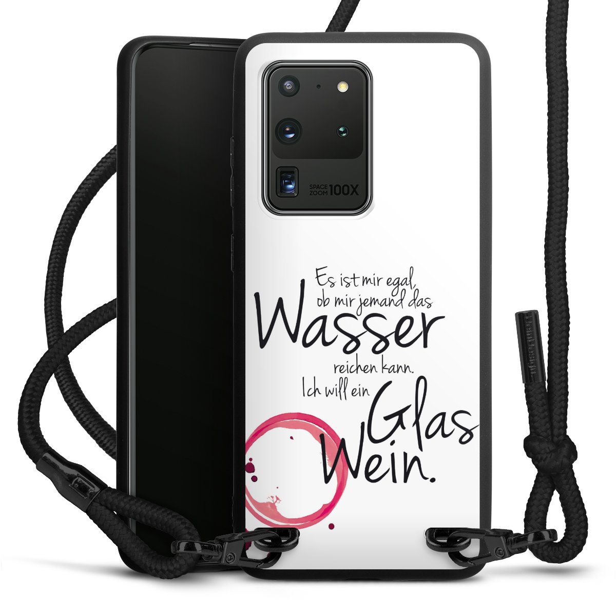 Pure Black: Handyhülle, Stoffband und Metalldetails in stylischem Mattschwarz.