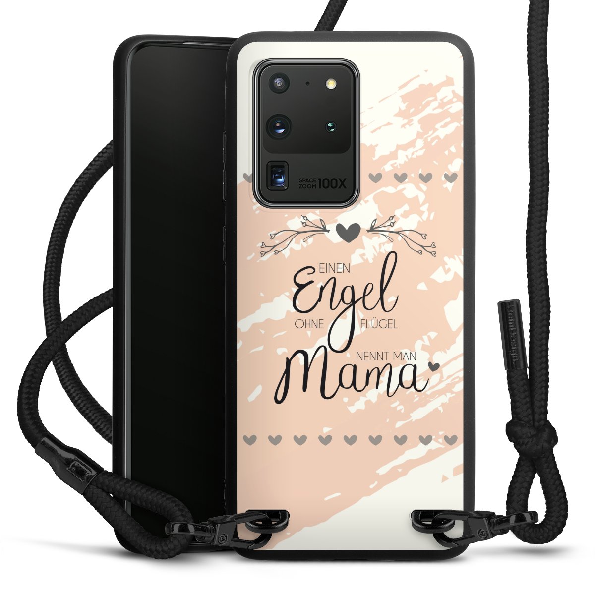 Pure Black: Handyhülle, Stoffband und Metalldetails in stylischem Mattschwarz.