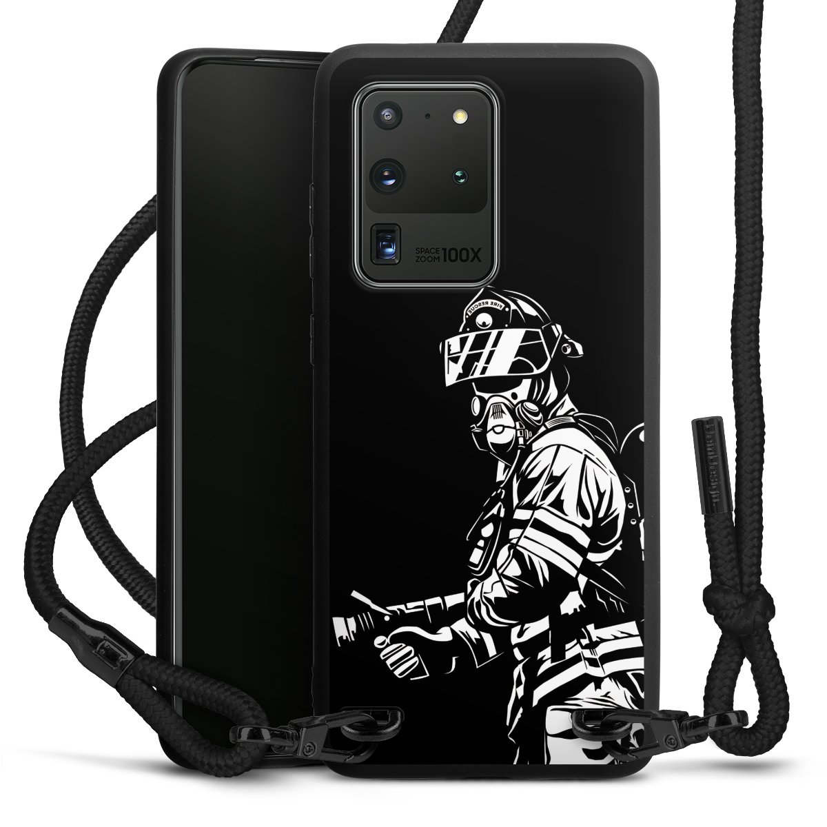 Pure Black: Handyhülle, Stoffband und Metalldetails in stylischem Mattschwarz.
