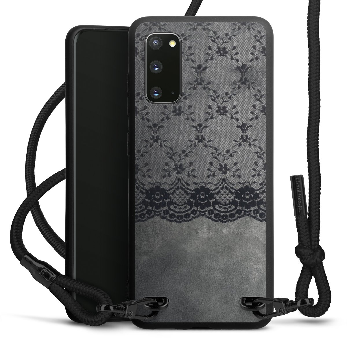 Pure Black: Handyhülle, Stoffband und Metalldetails in stylischem Mattschwarz.