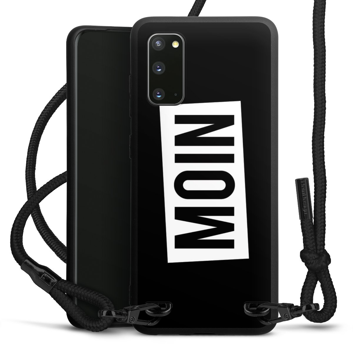 Pure Black: Handyhülle, Stoffband und Metalldetails in stylischem Mattschwarz.