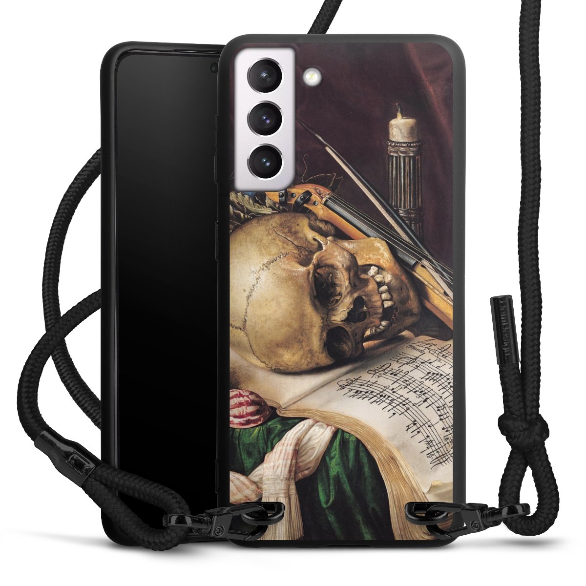 Pure Black: Handyhülle, Stoffband und Metalldetails in stylischem Mattschwarz.
