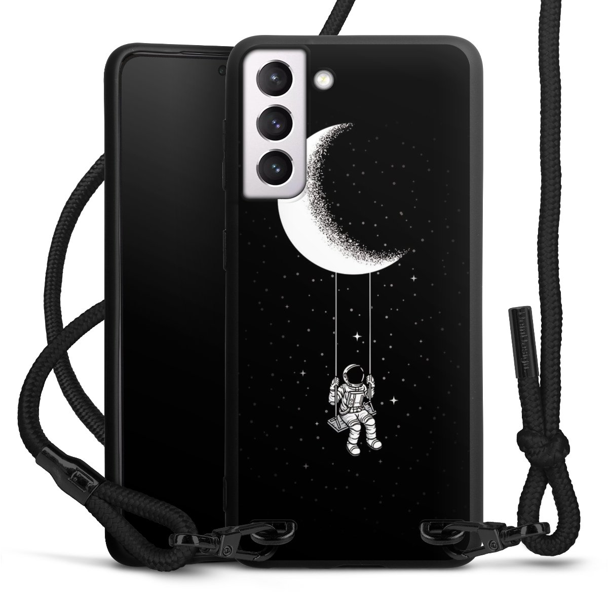 Pure Black: Handyhülle, Stoffband und Metalldetails in stylischem Mattschwarz.