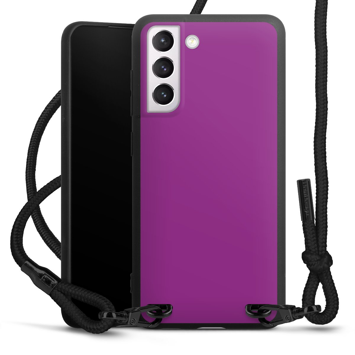 Pure Black: Handyhülle, Stoffband und Metalldetails in stylischem Mattschwarz.