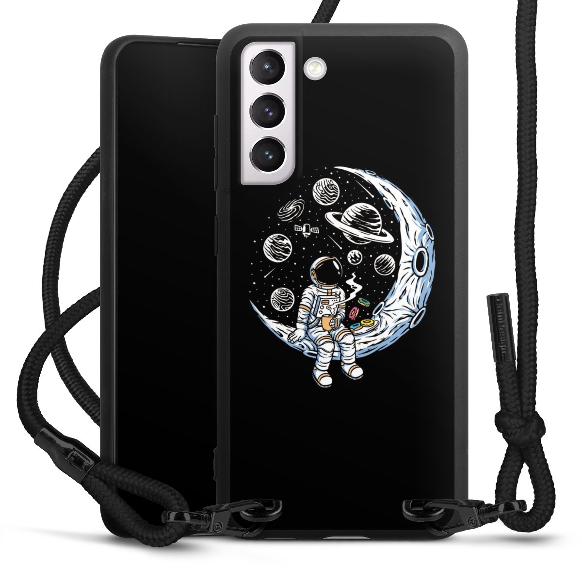 Pure Black: Handyhülle, Stoffband und Metalldetails in stylischem Mattschwarz.