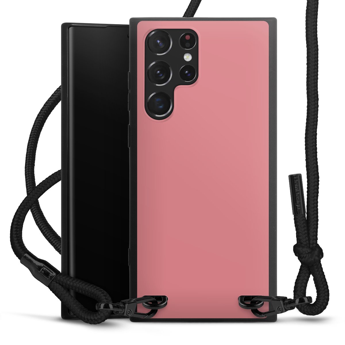 Pure Black: Handyhülle, Stoffband und Metalldetails in stylischem Mattschwarz.