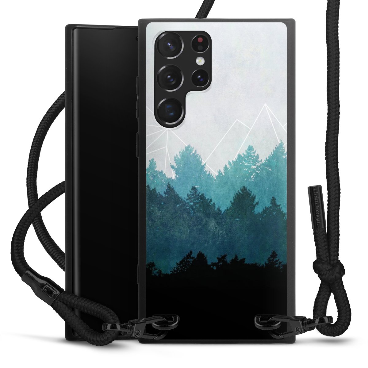 Pure Black: Handyhülle, Stoffband und Metalldetails in stylischem Mattschwarz.