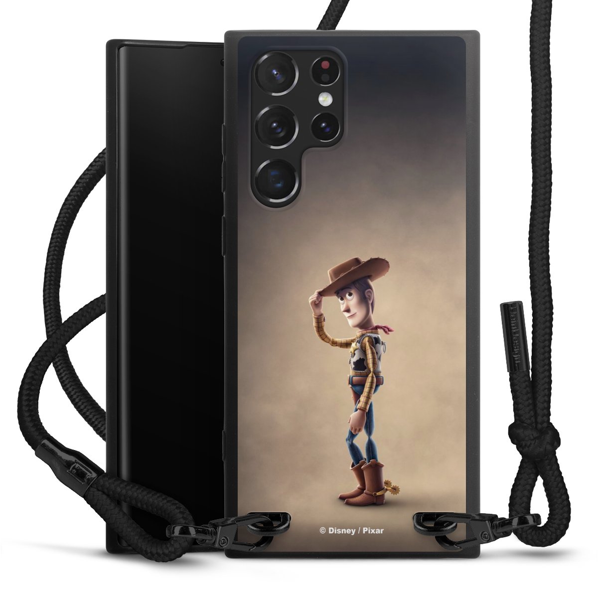 Pure Black: Handyhülle, Stoffband und Metalldetails in stylischem Mattschwarz.