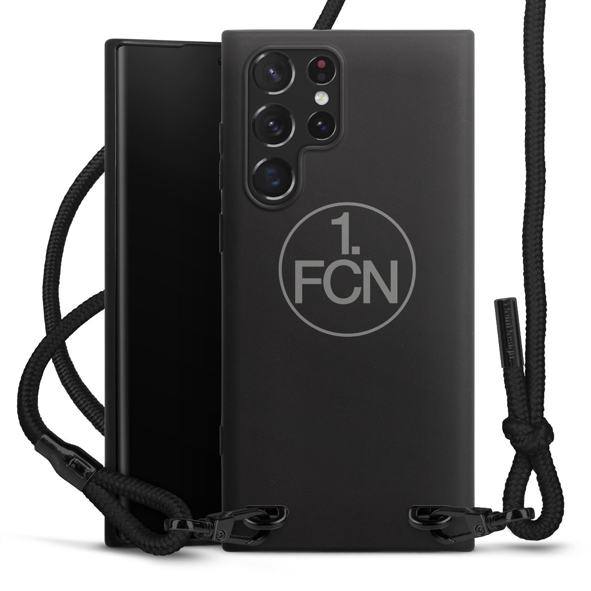 Pure Black: Handyhülle, Stoffband und Metalldetails in stylischem Mattschwarz.