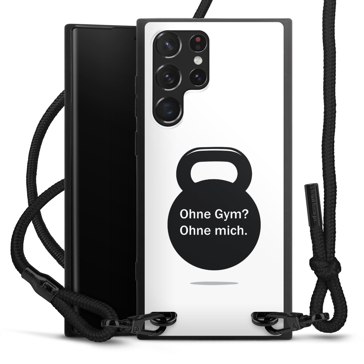 Pure Black: Handyhülle, Stoffband und Metalldetails in stylischem Mattschwarz.