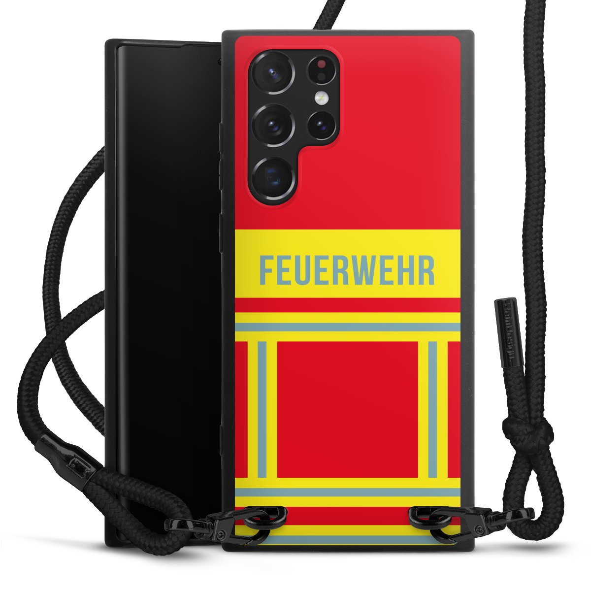 Pure Black: Handyhülle, Stoffband und Metalldetails in stylischem Mattschwarz.