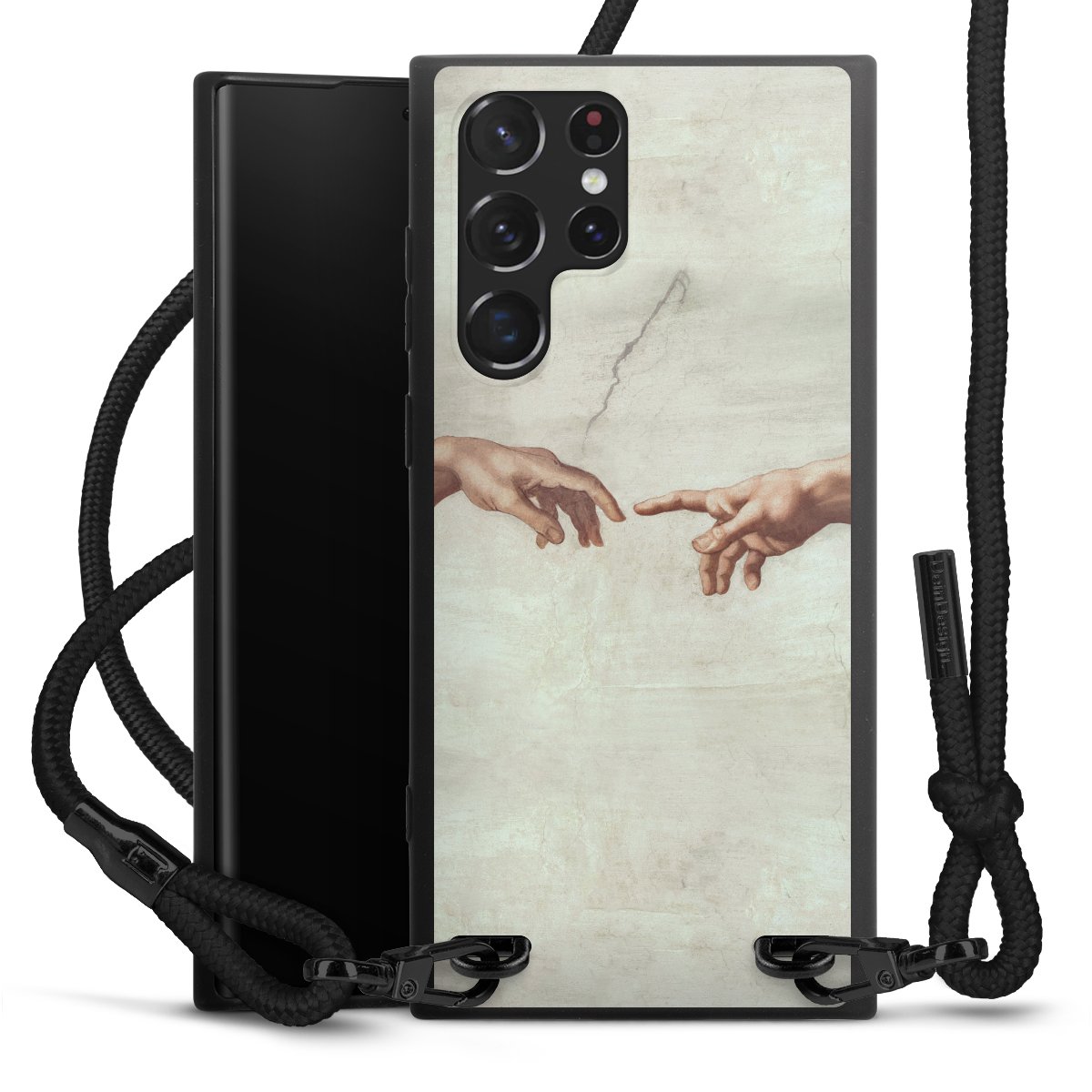 Pure Black: Handyhülle, Stoffband und Metalldetails in stylischem Mattschwarz.