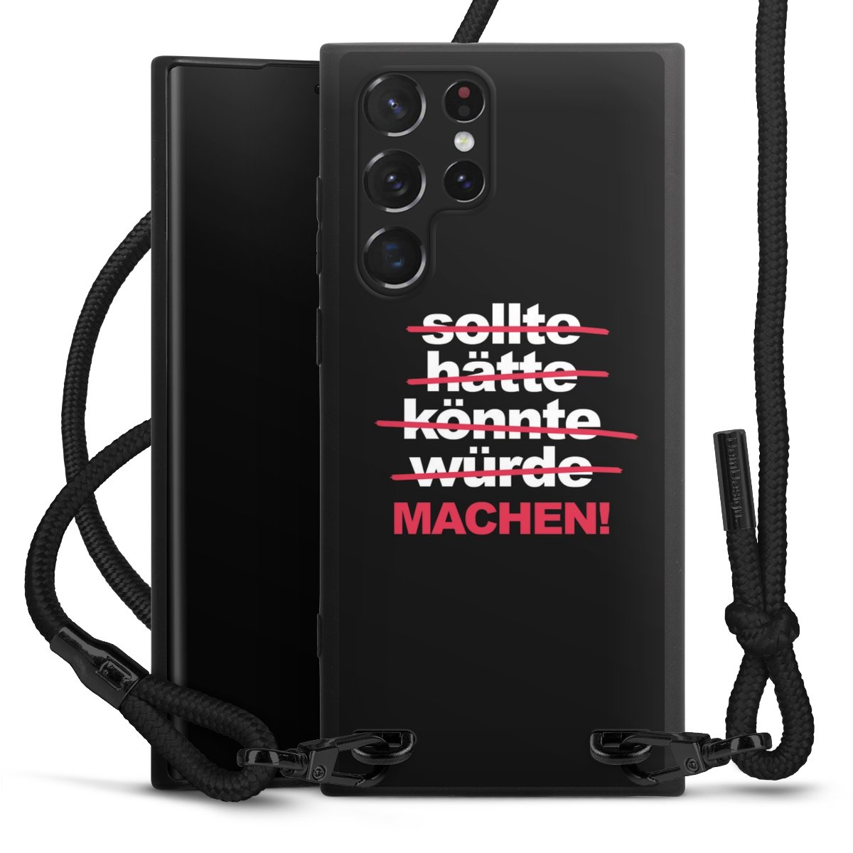 Pure Black: Handyhülle, Stoffband und Metalldetails in stylischem Mattschwarz.