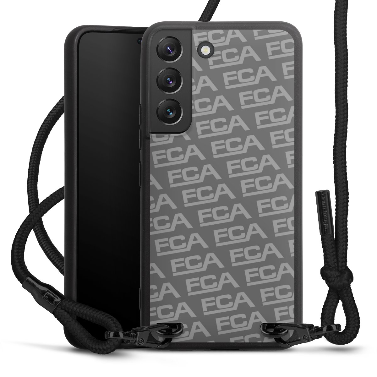 Pure Black: Handyhülle, Stoffband und Metalldetails in stylischem Mattschwarz.