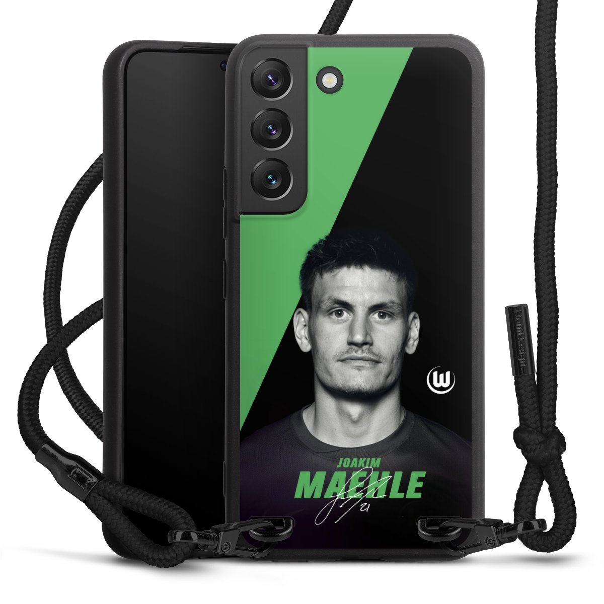 Pure Black: Handyhülle, Stoffband und Metalldetails in stylischem Mattschwarz.